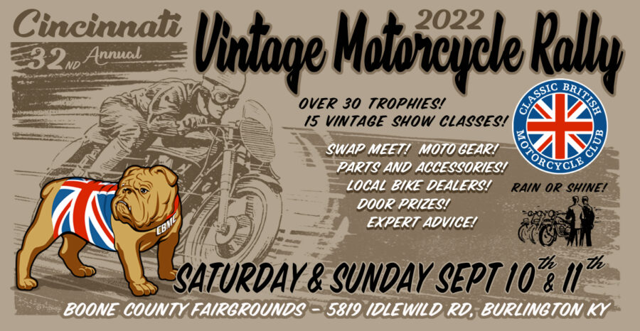 Classic British Motorcycle Club of Cincinnati is pleased to announce that the 2022 32nd Annual Vintage Motorcycle Rally will be held at the Boone County Fairgrounds Burlington, KY on Sept 9-11th, 2022. Mark your calendars!